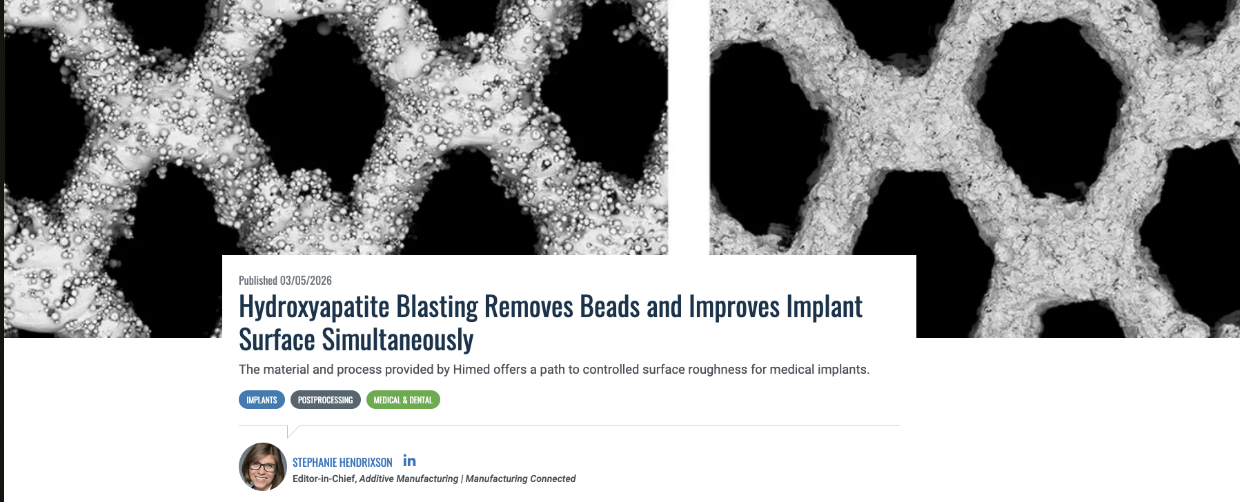This article in Additive Manufacturing by Stephanie Hendrixson highlights how Himed’s hydroxyapatite-based MCD Apatitic Abrasive addresses one of the persistent challenges in 3D-printed medical implants: removing loosely adherent build material while achieving a biologically favorable surface.